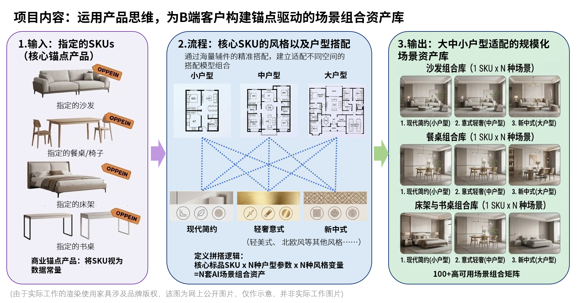 - Establish Business Anchors: Deeply understand B-end business demands, taking Oppein's real selling products (specific sofas, dining tables, bed frames, desks) as the absolute core of scene generation (Anchor SKU).